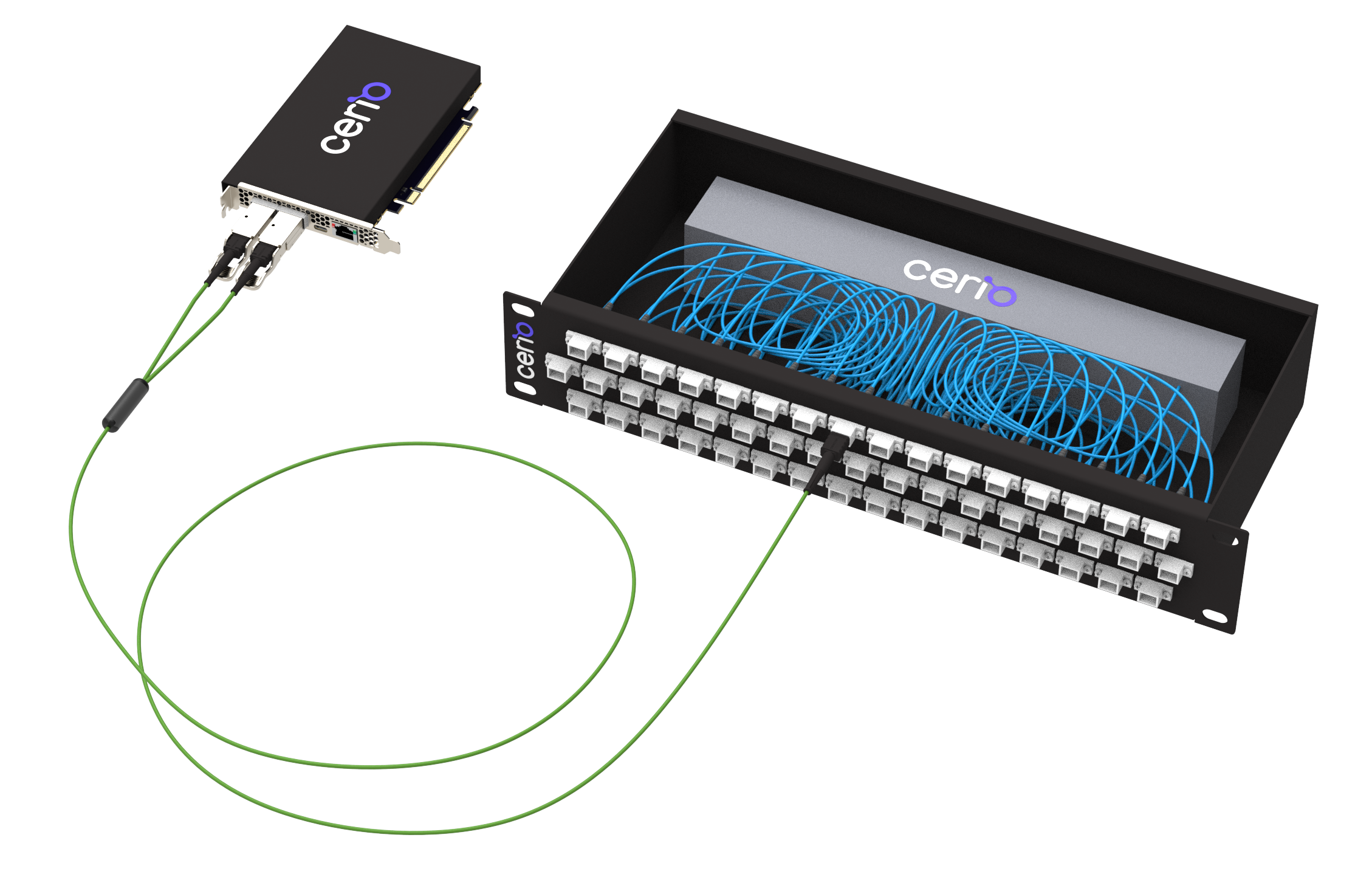 Fabric SHFL: Using a single optical cable to connect each Fabric Node to an optical port, the Cerio interconnect, called a SHFL, implements pre-wired topologies with no configuration and zero power and cooling.